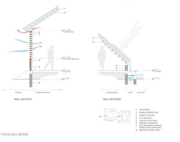 Como um dos exemplos dessa fusão de técnica vernacular com novo desenho; as paredes de tijolo perfurado que incorporam uma tecnologia local para circulação de ar, tomaram nova forma, projetadas por Toshiko.