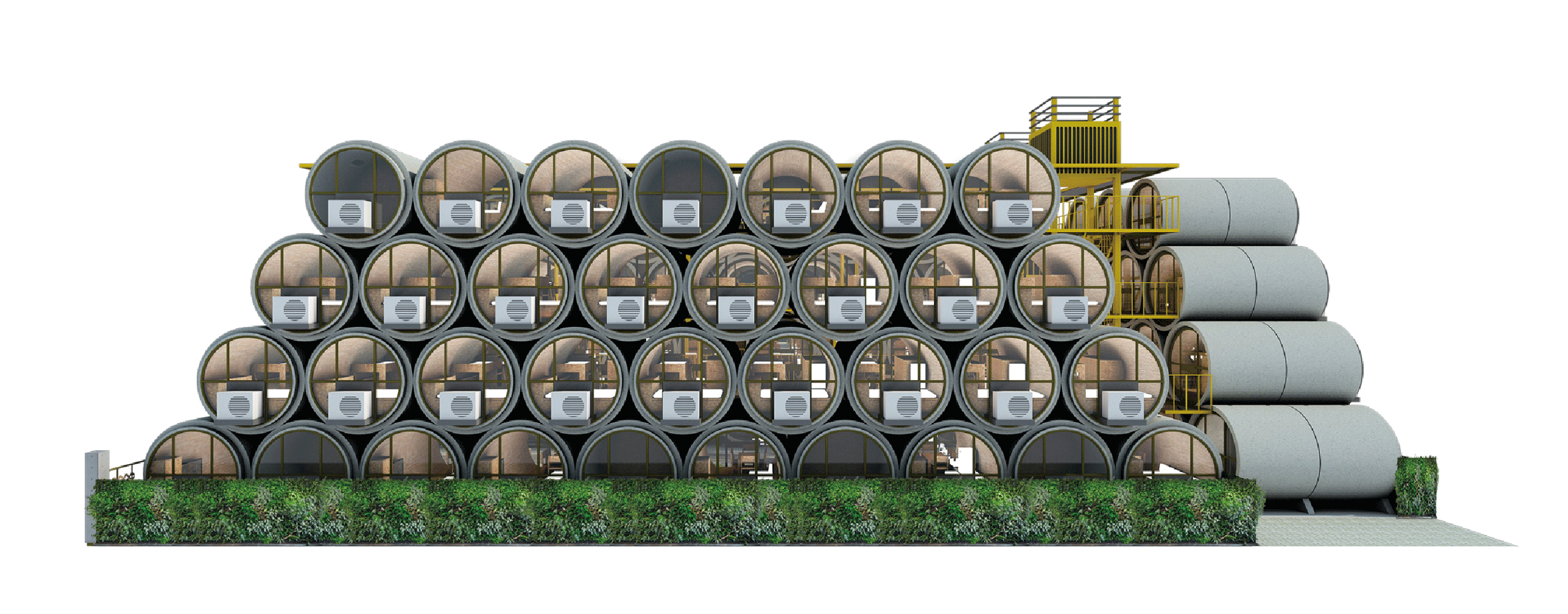 As primeiras casas já foram desenvolvidas em Hong Kong e transformam os 2,5 metros de diâmetro do tubo em moradias funcionais para uma ou duas pessoas em um espaço total de 9,3m².