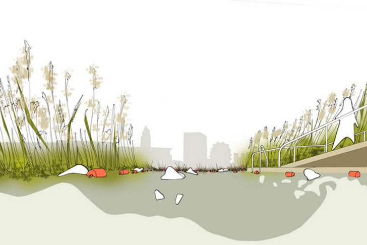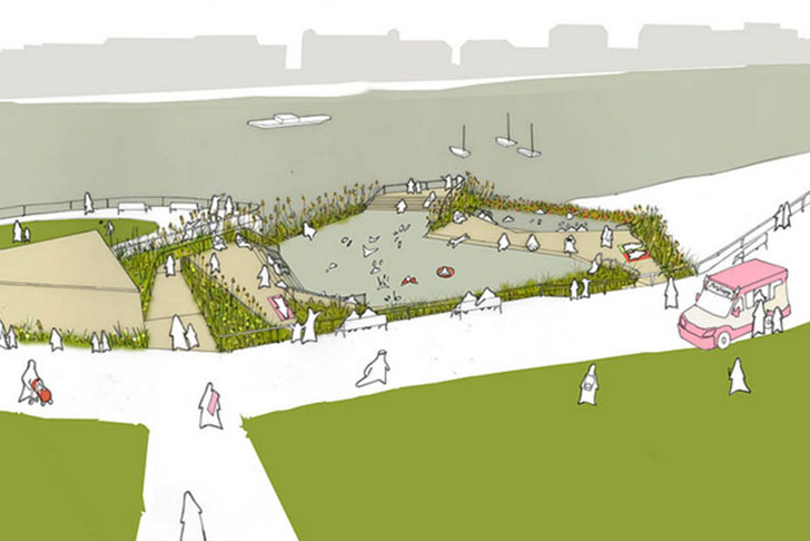 Em torno das piscinas estão projetados decks para criar uma área de descanso para os banhistas, rodeados de plantas para manter o ambiente o mais natural possível. Ao longo do tempo, algas, samambaias e plantas nativas cresceriam livremente nas áreas plantadas da piscina e os londrinos teriam a chance de recuperar o seu maior espaço público ao ar livre, o rio.